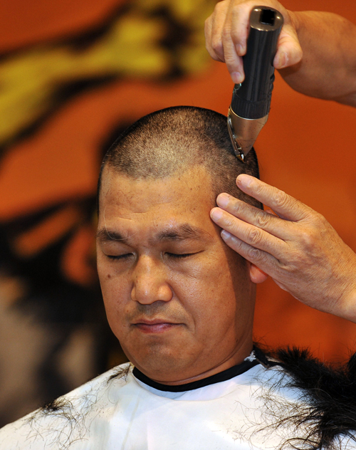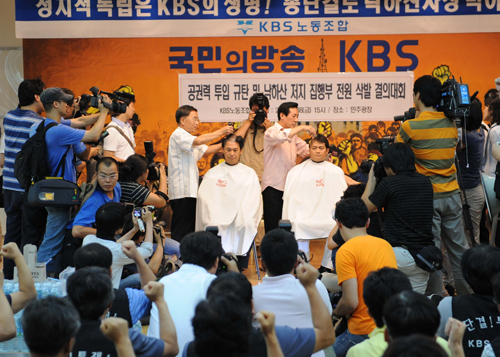 | ▲ KBS 노조 집행부 전원 삭발 / 8일 오후 서울 여의도 KBS 본관 로비에서 공권력 투입 규탄 및 낙하산 저지를 위한 결의대회에서 KBS 노조 집행부전원이 삭발을 하고 있다. ⓒ뉴시스 | ||