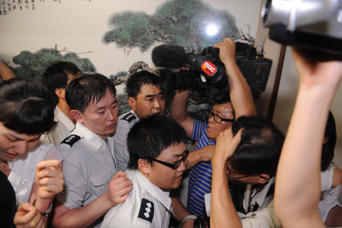 | ▲ 카메라 기자를 막아라 / 8일 오전 여의도 KBS 본관 제1회의실에서 정연주 사장에 대한 해임 제청에 대한 KBS 이사들의 임시이사회가 열리고 있는 가운데 회의장에 들어가려는 취재진을 경찰들과 청경들이 밀쳐내고 있다. ⓒ뉴시스 | ||
