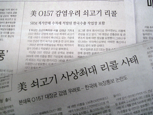 서울신문과 서울경제는 11일 각각 ‘美 O157감염우려 쇠고기 리콜’(18면)과 ‘美 쇠고기 사상 최대 리콜 사태’(2면)란 기사를 통해 같은 내용을 기사화했다.
