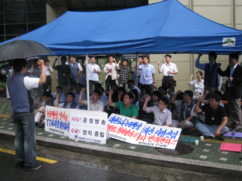 ▲ “비가 오는 날에도 계속 됩니다.” YTN 노조(위원장 노종면)가 비가 내리는 중에도 13일 오전 8시 서울 남대문로 YTN 사옥 후문에서 새 집행부 출정식을 겸한 ‘구본홍 출근 저지 투쟁’ 집회를 벌이고 있다. |