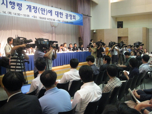 언론노조 채수현 정책국장은 “언론노조에서 시행령 개정안과 관련해 공청회를 요구하면서 방통위원, 현업인들이 참여한 자리에서 공청회를 열어야 한다고 전달했다”며 “그러나 방통위는 이런 언론노조의 요구를 무시했으며 정책 결정권자인 방통위원들이 한명도 참석하지 않았다”고 주장했다.