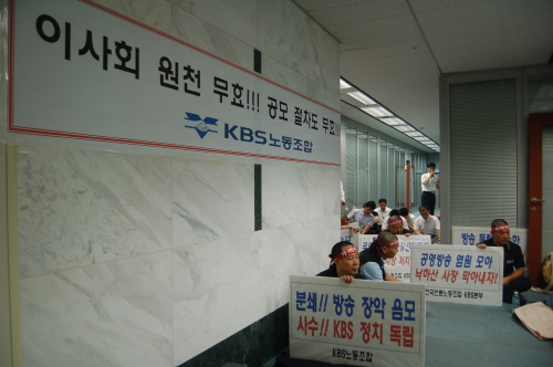 KBS노조원과 사원행동 소속 사원 20여명은 14일 오전부터 KBS 신관 5층 이사회 사무국으로 가는 통로를 가로막고 연좌 농성을 벌이고 있다.