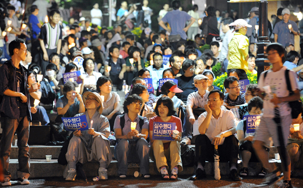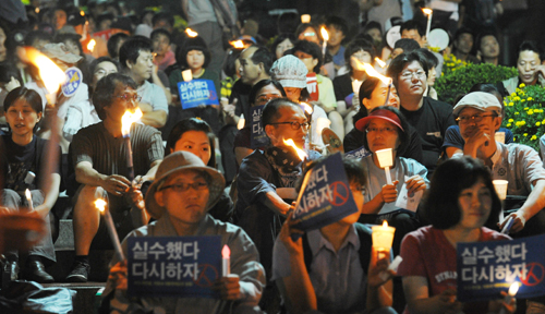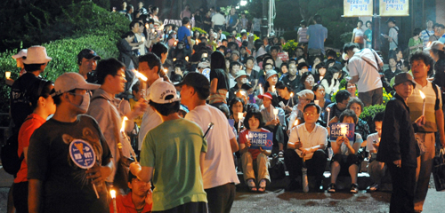 | ▲ 101차 촛불, 촛불은 계속된다 / 101차 미국산 쇠고기 수입 반대 촛불집회가 열린 16일 밤 서울 명동성당 앞에서 참가자들이 촛불을 들고 앉아 있다. ⓒ뉴시스 | ||