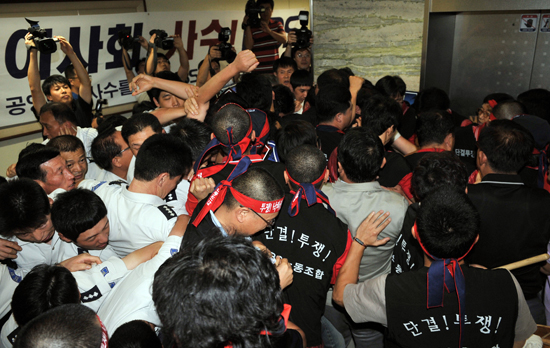 | ▲ KBS 이사회 개최,노사 충돌 / KBS 사장후보 서류심사를 위한 임시이사회가 열릴 예정인 21일 오전 여의도 KBS 본관에서 이사회의장을 봉쇄하려는 노조원과 이를 막는 청원경찰들이 몸싸움을 하고 있다. ⓒ뉴시스 | ||