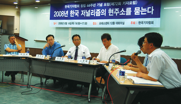 한국기자협회 창립 44주년 기념 포럼 ‘2008년 한국 저널리즘의 현주소를 묻는다’가 13일 서울 광화문 한국프레스센터 12층 한국언론재단 대강의실에서 열려 최근 촛불정국에서 나타난 한국 언론의 전반적인 문제점에 대해 논의했다.