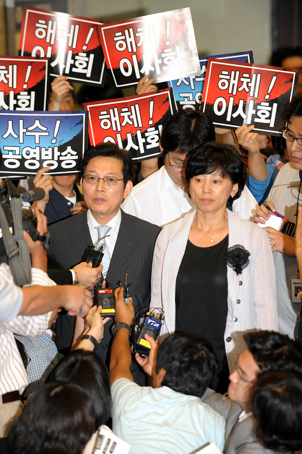 | ▲ KBS이사회 야당 성향 이사 4명 퇴장 / KBS 차기 사장 후보자 면접을 위한 임시이사회가 25일 오전 서울 여의도 KBS방송국 본관에서 열린 가운데 야당 성향의 이기욱(왼쪽), 남윤인순 이사가 이사회에서 퇴장하며 취재진에게 입장을 밝히고 있다. 이날 이사회에서 야당 성향의 남윤인순, 이기욱, 이지영, 박동영 이사가 퇴장했으며 현재 여당성향의 이사들만이 참석해 면접을 진행중이다. ⓒ뉴시스 | ||