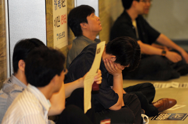 | ▲ 고개숙인 KBS 사원 / KBS 차기 사장 후보자 면접을 위한 임시이사회가 열린 25일 오전 서울 여의도 KBS방송국에서 사원들과 노조원들이 회의장으로 향하는 승강기와 복도를 점거하고 있다. ⓒ뉴시스 | ||