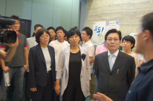 | ▲ 오전 10시경 KBS 본관에 도착한 이지영, 남윤인순, 이기욱 이사(앞줄 왼쪽부터)가 사장 후보자 면접이 열리는 6층 제3회의실로 올라가기 위해 엘레베이터를 기다리며 KBS 사원행동측 직원들의 이야기를 듣고 있다. | ||