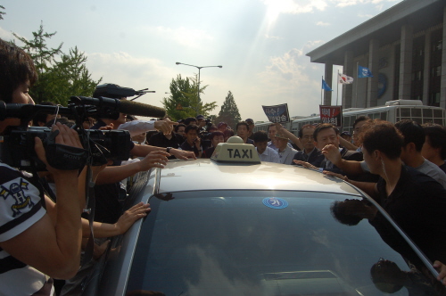 | ▲ KBS사원행동 측 직원들이 본관 앞에서 이병순 사장 임명 제청자가 탄 택시를 막아서자 전투경찰들이 진압에 나서 몸싸움을 벌이고 있다. | ||
