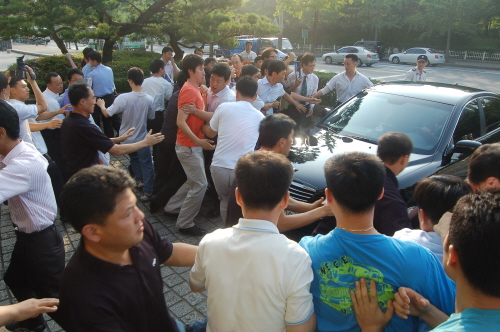 청원경찰 40여명은 지하 주차장 안쪽에 숨어있다가 이병순 사장의 차가 도착하자 갑자기 사원행동 측 직원들에게 달려들어 사장 승용차에 접근을 막았다.