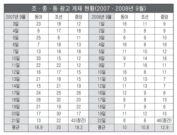 실제 전년 9월 동기대비 광고게재량은 급감한 것으로 나타났다. 본보 조사결과 조선이 46%, 동아가 48%, 중앙이 30% 감소했다. 2007년 9월 조선은 하루 평균 20개의 광고를 실었으나 올해는 10.8개에 그쳤다.