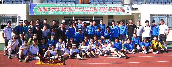▲ 27일 제주도 서귀포강창학경기장에서 열린 제3회 한국기자협회 전국시도협회 친선축구대회에서 결승전이 끝난뒤 대회 관계자와 선수들이 한자리에 모여 기념 촬영을 했다. |