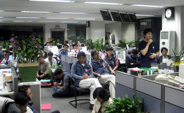▲ YTN 노조가 6일 오후 7시 서울 남대문로 사옥 19층 보도국에서 1백50여명이 참석한 가운데 긴급 비상총회를 열고 있다. |