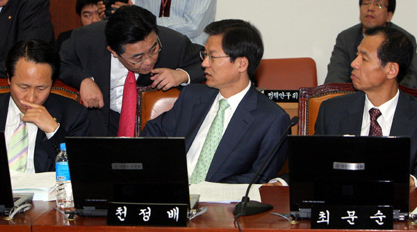 ▲ 7일 오후 문화체육관광방송통신위 국정감사에서 민주당 조영택, 전병헌, 천정배, 최문순 의원(왼쪽부터)이 YTN 사태에 대한 대응을 논의하고 있다. (연합뉴스) |