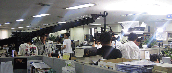 ▲ 한겨레 BCC추진팀이 지미짚 카메라를 이용해 장봉군 화백이 만평을 그리고 있는 장면을 촬영하고 있다. |