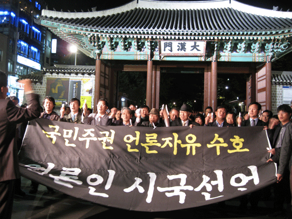 ▲ 시국선언 추진위가 24일 오후 7시 서울 태평로 프레스센터에서 서울 남대문로 YTN 사옥으로 가두행진을 펼치던 중 덕수궁 대한문 앞에서 '국민주권 언론자유 수호 언론인 시국선언'이라고 적힌 대형 플래카드를 펼쳐 보이고 있다. |