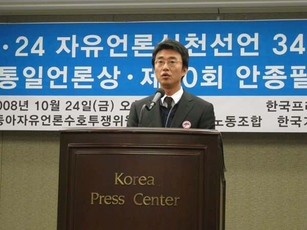 ▲ YTN 노조가 24일 오후 6시 서울 프레스센터에서 열린 10.24 자유언론실천선언 34주년 기념식 겸 제20회 안종필 자유언론상 시상식(제14회 통일언론상 시상식)에서 특별상을 수여 받았다. 사진은 노종면 노조위원장이 수상소감을 밝히는 모습. |