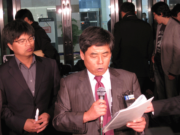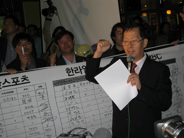 ▲ 새언론포럼 최용익 회장이 24일 오후 7시30분 YTN 사옥 앞에서 열린 시국선언 전국대회에서 행사를 제안한 취지를 밝히고 있다. |