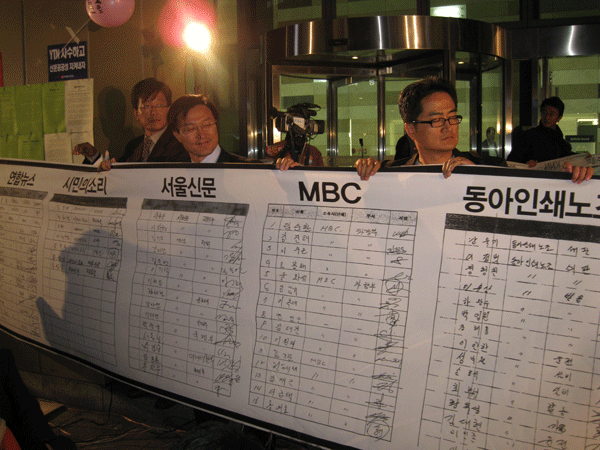 이들은 전국 7천8백여명의 언론인 서명이 적힌 대형 현수막으로 YTN 사옥을 감싸는 퍼포먼스를 선보이며 "언론인의 손으로 권력으로부터 언론 자유를 지키겠다"고 선언했다.
