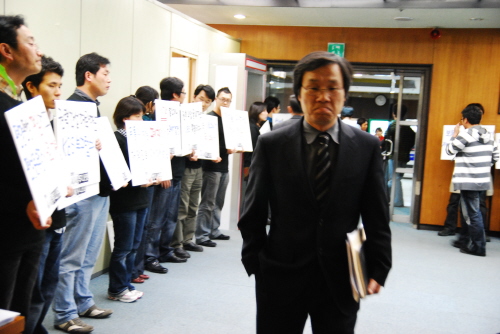 ▲ KBS 최종을 편성본부장이 12일 '미디어포커스'와 '시사투나잇'의 사실상 폐지를 반대하는 피켓 시위를 벌이는 기자와 PD들 사이를 지나 가을 개편 설명회에 참석하기 위해 회의실에 들어가고 있다. |