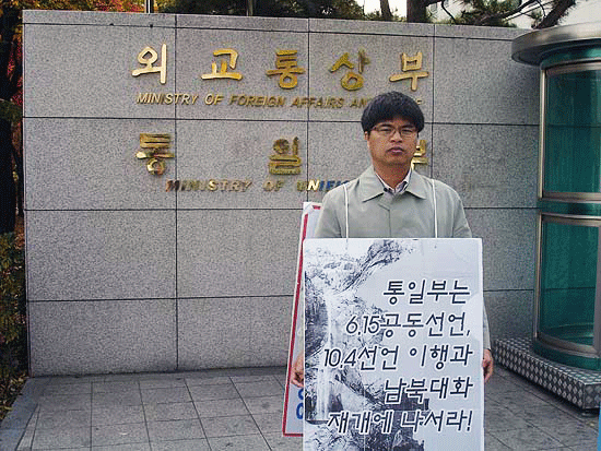▲ 14일 통일부 앞에서 이준희 6.15남측위원회 언론본부 공동대표(한국인터넷기자협회장)가 1인 시위를 하고 있다. |