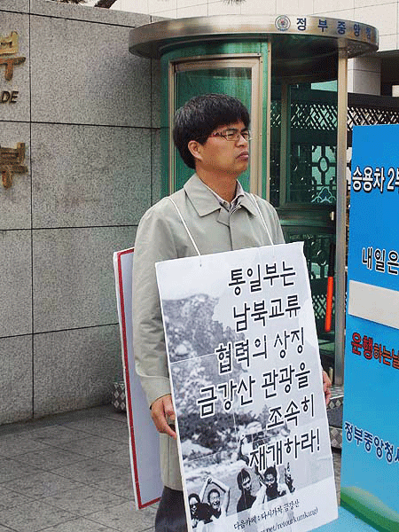 (서울=통일언론) 6.15공동선언과 10.4선언 이행과 금강산 관광 재개를 촉구하는 미디어다음 카페 '다시가자 금강산' 회원들의 통일부 앞 1인 시위가 4일째 이어졌다.