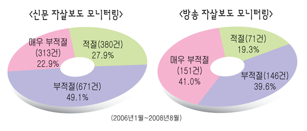 실제 국내 신문·방송 자살기사 모니터링(2006년 1월~2008년 8월) 결과 신문은 72%(적절 27.9% 부적절 49.1% 매우 부적절 22.9%), 방송은 80.6%(적절 19.3% 부적절 39.6% 매우 부적절 41%)가 부적절하게 자살을 보도한 것으로 나타났다.