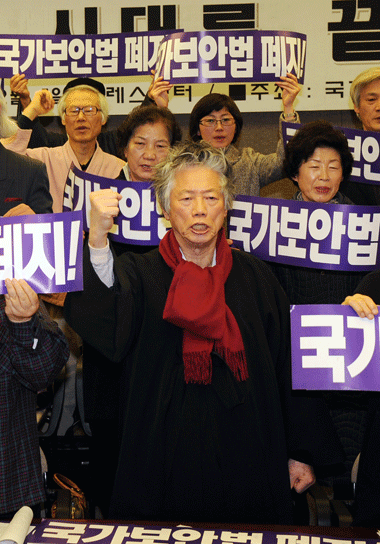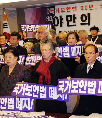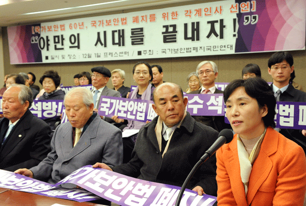 | ▲ 국가보안법폐지국민연대가 국보법 제정 60주년을 맞아 1일 오전 서울 중구 프레스센터에서 기자회견을 열고 '국가보안법 폐지'를 촉구하고 있다. 이들은 "국가보안법 60년은 씻을 수 없는 야만의 깊은 상흔을 한민족 구성원 모두에게 남겼다"며 "국가보안법이 지배하는 야만의 시대에는 인간의 양심과 자유, 민주주의는 처참하게 유린될 수밖에 없었다"고 주장했다. | ||