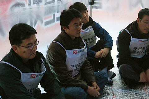 | ▲ 언론노조가 YTN 사수를 주장하며 천막 철야 농성에 돌입했다. YTN 노종면 노조위원장이 다른 지부장들과 함께 천막에 앉아 있다. | ||