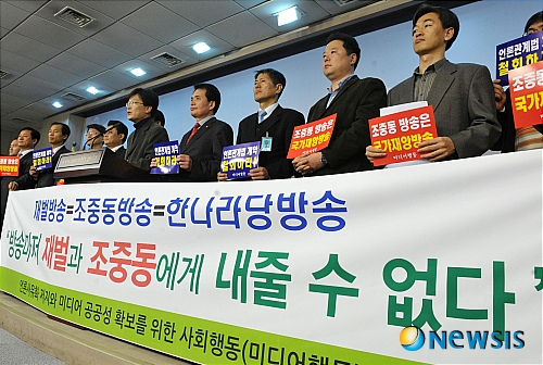 ▲ 야당과 미디어 관련 시민사회단체 등이 10일 오전 국회 정론관에서 한나라당이 내놓은 7개 언론관련법 개악안 철회하라며 기자회견을 하고 있다. 뉴시스 |