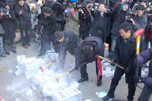 ▲ 26일 서울 여의도 국민은행 앞에서 열린 언론노조 총파업 출정대회에서 최상재 위원장, 김순기 부위원장, 박성제 MBC본부장 등이 언론 7대 악법의 이름이 박힌 얼음을 망치로 깨는 퍼포먼스를 벌이고 있다. |
