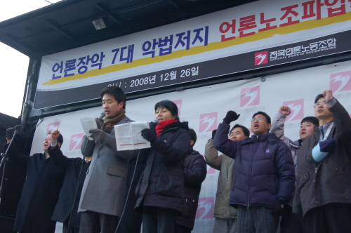 전국언론노동조합(위원장 최상재, 이하 언론노조)은 26일 서울 여의도 국민은행 앞에서 총파업 출정대회를 열고 한나라당이 언론 7대 악법을 통과시킬 경우 정권 퇴진 운동에 나서겠다고 결의를 다졌다.