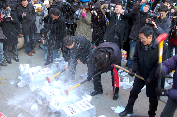 ▲ 지난해 12월 26일 서울 여의도 국회 앞에서 열린 언론노조 총파업 출정식에서 최상재 위원장 등 언론노조 대표들이 ‘언론 7대 악법’의 이름이 새겨진 얼음을 망치로 깨는 퍼포먼스를 벌이고 있다. |