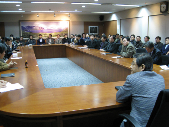 ▲ YTN 배석규 전무가 18일 오후 4시 부.팀장 60여명이 모인 가운데 긴급 확대간부회의를 주재하고 있다. 간부들은 이날 회의를 통해 노조의 사장실 점거와 출근 저지 투쟁 등에 단호히 대처하기로 의견을 모았다. |