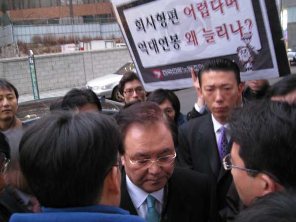 | ▲ YTN 구본홍 사장이 2일 오전 7시30분 YTN 사옥 후문에서 고개를 숙이고 눈을 감은 채, 부·팀장 인사와 19명 고소 사태와 관련한 조합원들의 질문을 듣고 있다. | ||