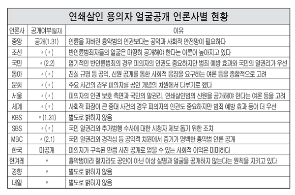경향·한겨레·한국 등 미공개…국민 합의·윤리강령 선행돼야경기 서남부지역 연쇄살인 용의자 강모씨의 마스크와 모자가 벗겨졌다. 중앙일보와 조선일보가 지난 1월31일자 신문에 얼굴 사진을 공개하면서다. SBS, KBS, MBC 등 지상파 3사도 이 대열에 합류했다. 2일에는 국민일보, 동아일보, 문화일보, 서울신문, 세계일보 등 대부분 중앙일간지가 강씨의 얼굴을 신문에 실었다.