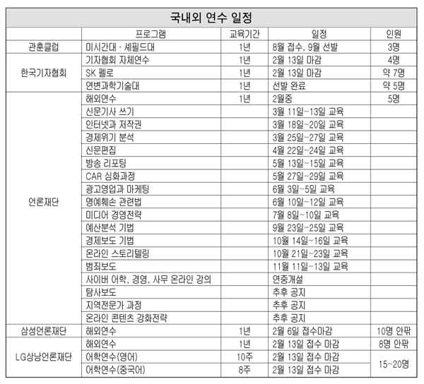올해도 한국기자협회, 한국언론재단, 삼성언론재단, LG 상남 언론재단 등에서 기자 연수 프로그램이 가동된다.