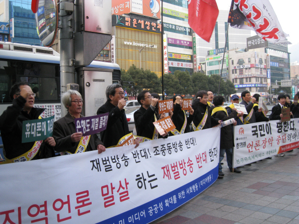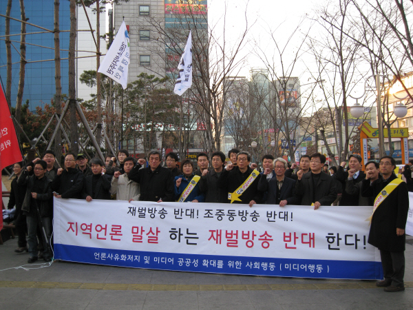 미디어행동은 이날 오후 5시 부산시 서면 태화로 일대로 자리를 옮겨 부산 지역시민단체, 네티즌 단체, 야당 지역구 의원 등과 함께 전단지를 배포하고 가두행진을 벌이는 거리 선전전을 펼쳤다.