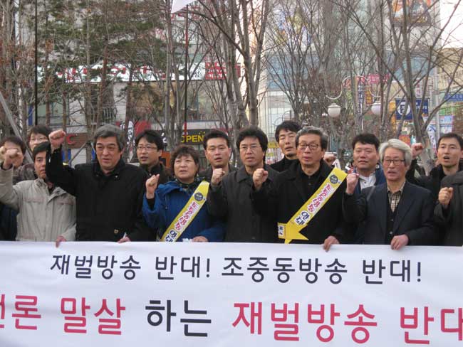 ▲ 미디어행동의 영남권 순회 투쟁에 나선 언론계 인사들이 8일 대구 2.28기념중앙공원 앞에서 구호를 외치고 있다.