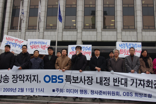 OBS 희망조합(위원장 김인중), 언론사유화저지 및 미디어 공공성 확대를 위한 사회행동(미디어행동), 인천지역새방송창사준비위원회(창준위)는 11일 오전 서울 한국프레스센터 앞에서 공동 기자회견을 갖고 “MB 특보 출신 사장 내정을 반대한다”고 밝혔다.