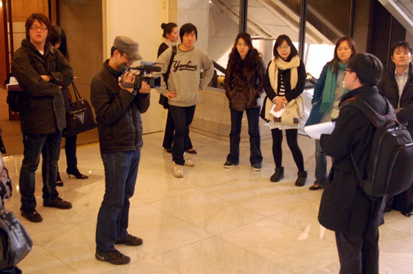 ▲ 지난달 30일 KBS 드라마 ‘미워도 다시한번’ 제작발표회에서 출입 통제 조처에 항의해 집단 퇴장한 KBS 출입기자들이 행사장 앞에 모여 대책을 논의하고 있다. |