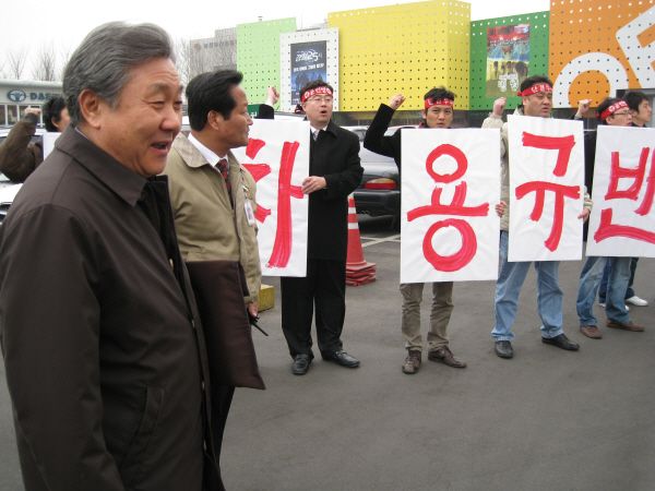 ▲ OBS 희망조합 조합원들이 12일 오후 1시30분 '차용규 사장 선임 반대'를 외치고 있는 가운데 백성학 이사회 의장(영안모자 회장)이 이사회에 참석하기 위해 OBS 사옥으로 들어서려 하고 있다.