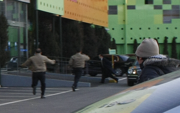 | ▲ OBS 차용규 사장이 16일 오전 7시45분 조합원들의 눈을 피해 쪽문을 이용, 본사로 뛰어들어가고 있다.(사진=언론노조) | ||