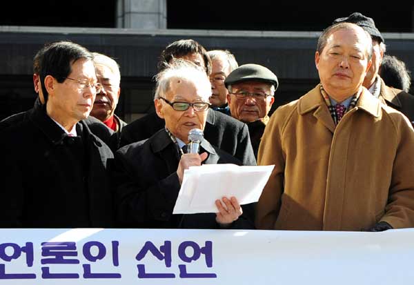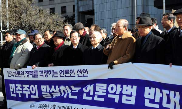 16일 오후 서울 프레스센터 앞에서 언론의 장래를 걱정하는 원로 언론인들이 '민주주의 말살하는 언론악법 반대한다'라는 주제로 시국선언을 갖고 있다.