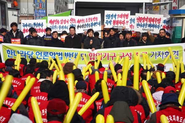 ▲ 전국언론노동조합(위원장 최상재)은 20일 서울 여의도 한나라당사 앞에서 ‘미디어법 합의기구 구성’을 촉구하는 기자회견을 열고 있다.