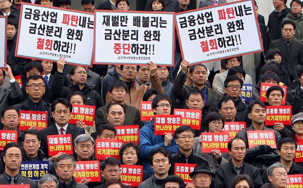 ▲ 24일 오전 국회 본청 계단에서 야4당과 시민단체 대표들이 참석한 가운데 열린 `MB악법 저지와 용산참사 진상규명 결의대회’에서 언론노조 등 참석자들이 ‘재벌방송은 한나라당 방송’이라고 적힌 팻말을 들고 동참하고 있다.(연합뉴스) |
