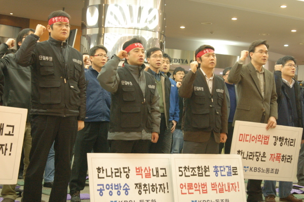 KBS 노조는 27일 서울 여의도 KBS 본관 1층 민주광장에서 3백여명의 조합원이 모인 가운데 '미디어 악법 날치기 상정 규탄 결의대회'를 열고 이같이 밝혔다.