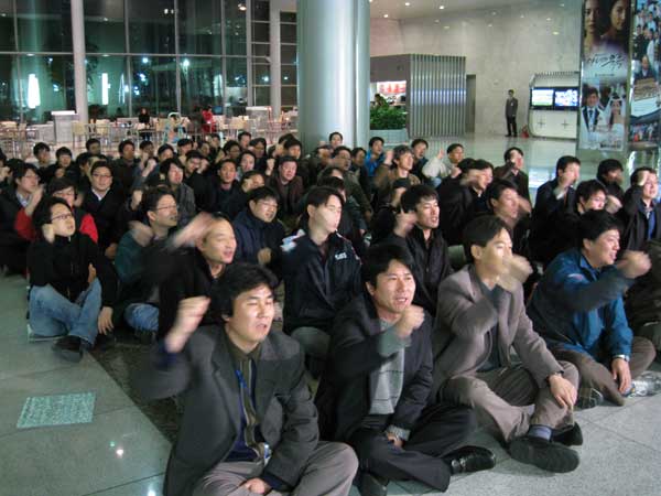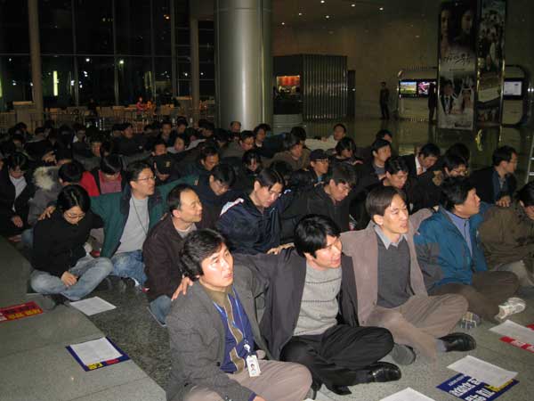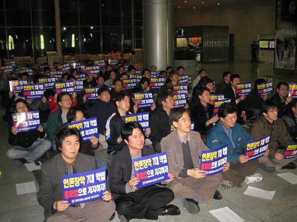 사진은 SBS 노조가 26일 오후 7시 ‘한나라당 언론악법 날치기 상정 미수 결의대회’를 갖고 있는 모습.