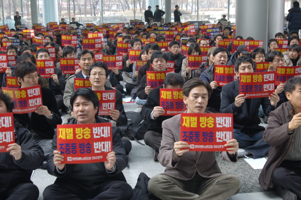 SBS 노조(위원장 심석태)도 이날 오전 11시 서울 목동 SBS 사옥 1층 로비에서 조합원 3백여명이 모여 비상총회를 열고 제작거부 투쟁에 들어갔다.