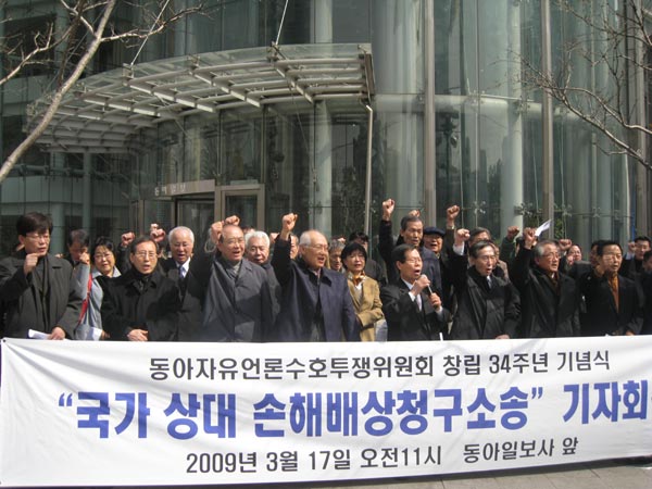 17일 서울 세종로 동아일보사 앞에서 열린 동아투위 결성 34주년 기념식에서 참석자들이 ‘동아일보는 각성하라’는 구호를 외치고 있다.
